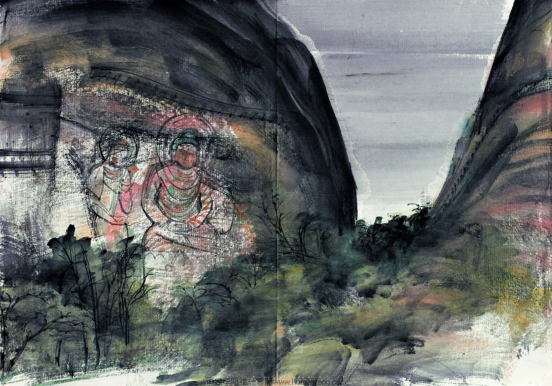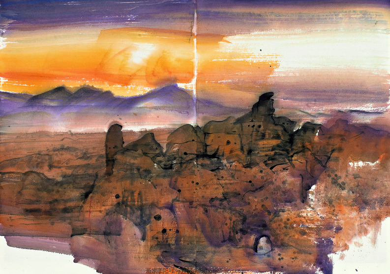 我和白熊直奔千佛洞,全是山路,极其艰难。这是一个山沟,有条河从川道蜿蜒流过,有三十公里长的绿洲,但一直开车到了河的尽头,也没发现千佛洞。向所有的人打听千佛洞,没有人知道,也没人会说汉语,直到我们走出绿洲,连牧羊人都很少见到了,这时最后一抹斜阳照在山顶上,我拿出册页开始写生,两边山上时不时有干裂的石头滚下来。我们戴月返程,九十多公里路跑了两个多小时。写于9月23日叶城。