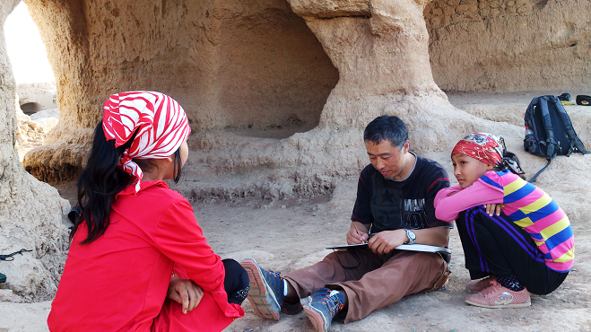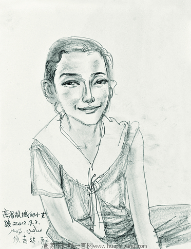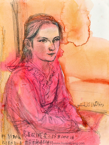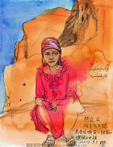 我们转完村子,山后面有高高的雪山,查地图可能是乌孜塔格峰。玄奘法师在他的《大唐西域记》里记录这是古精绝国。就到普鲁村找艾再孜的同学,可惜不在。我问能画小朋友吗,他们老师就派来了一个叫如克娅的小女孩来当模特儿。后来一口气画了好几张维吾尔族小朋友,最后画不动了,收拾东西上车,又到另一个地方。写于2012年9月28日