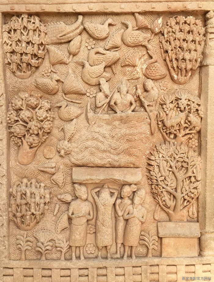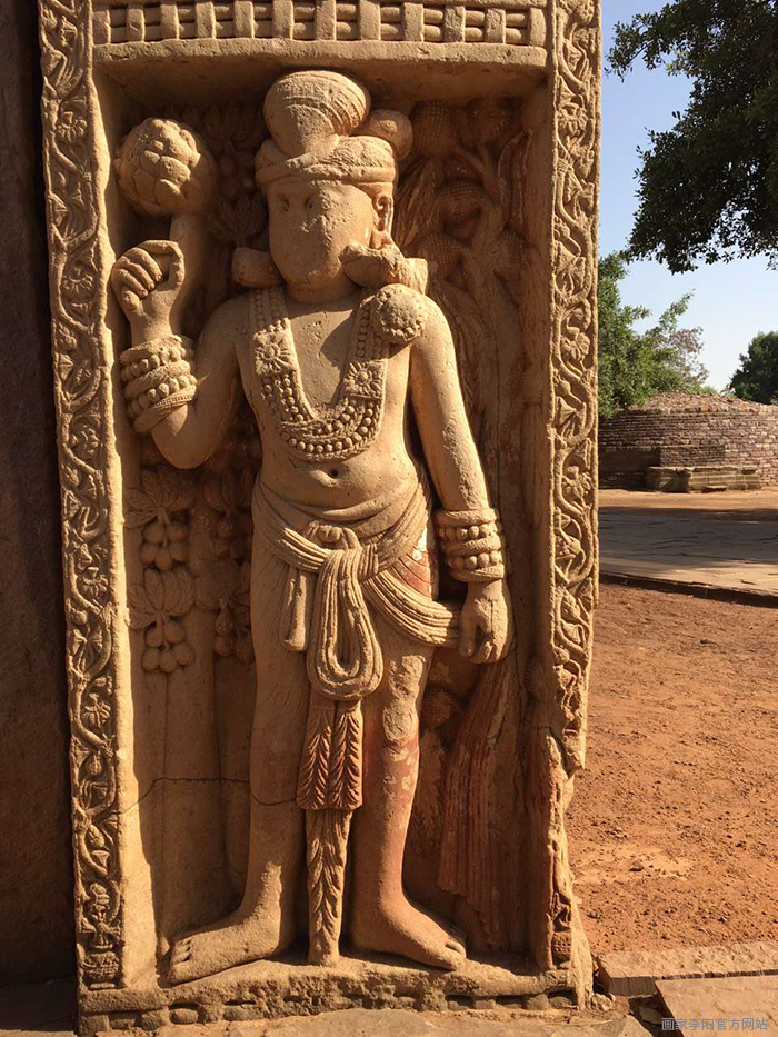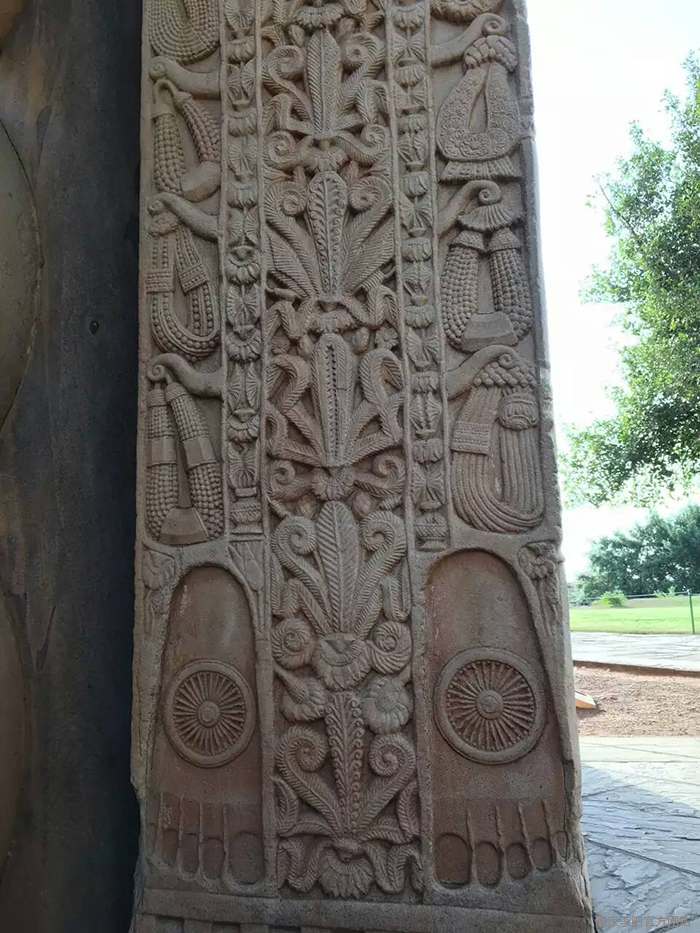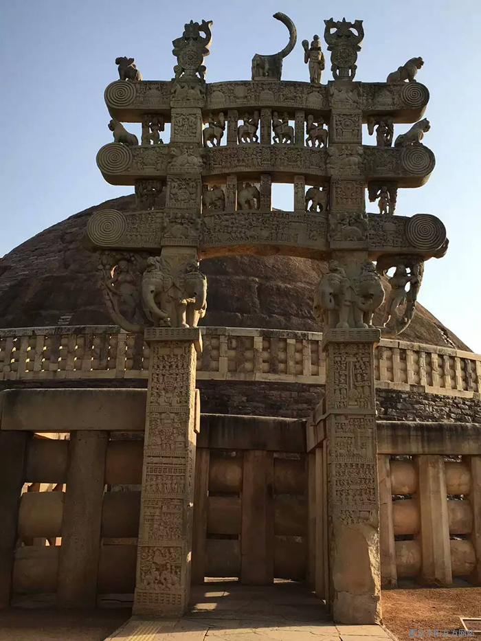 第一大塔位于桑吉遗址中心位置,半球形,也叫覆钵形吧,直径36.6米,高16.5米。佛塔基座为阿育王于公元前3世纪所建,其余部分于公元2至1世纪完成。塔的四周分别有四座塔门,门上雕刻着佛陀的历程和他前世的传说,塔的上部是由姿态优美的仙女捧起的门楣,门上的雕刻非常著名,堪称早期佛教雕刻的典范,保护的也相当完好,真是奇迹!在可供膜拜的佛陀形像出现之前,佛造像一般用菩提树、佛塔、佛脚印或法轮来代替。而这里的塔门和围栏上随处可见代表佛塔的菩提树、法轮等浮雕,装饰趣味非常浓厚,甚至很多物象趋向图案化,以适应画面的需求。古代工匠的想象力和创造能力惊人,在不同地方出现的荷花形象至少上百处,却没有一处是重复的,有像插花样的写实荷花,也有几何纹样的荷花图案。如果你专注的只找荷花,这三座佛塔周边的各种荷花浮雕会让你惊喜不断!
